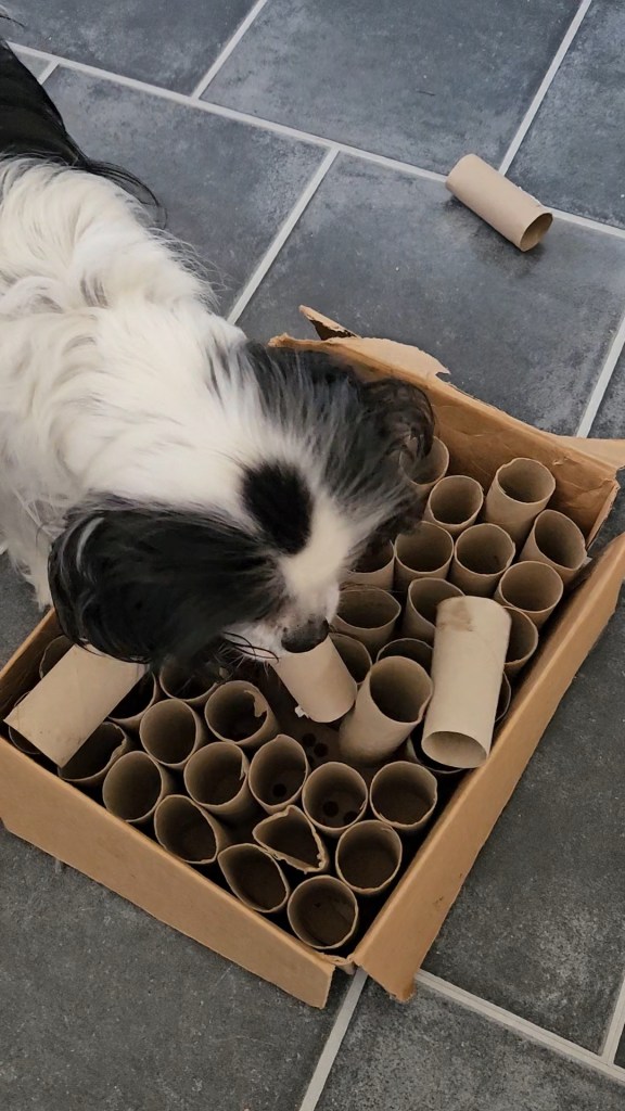 - Torrfoder i toarulle i en kartong – du kan ta flera toarullar och några med mat och andra inte. Även lägga lite mat löst i kartongen och kanske fylla med något mer som lägg i ihoprullade kompostpåsar.